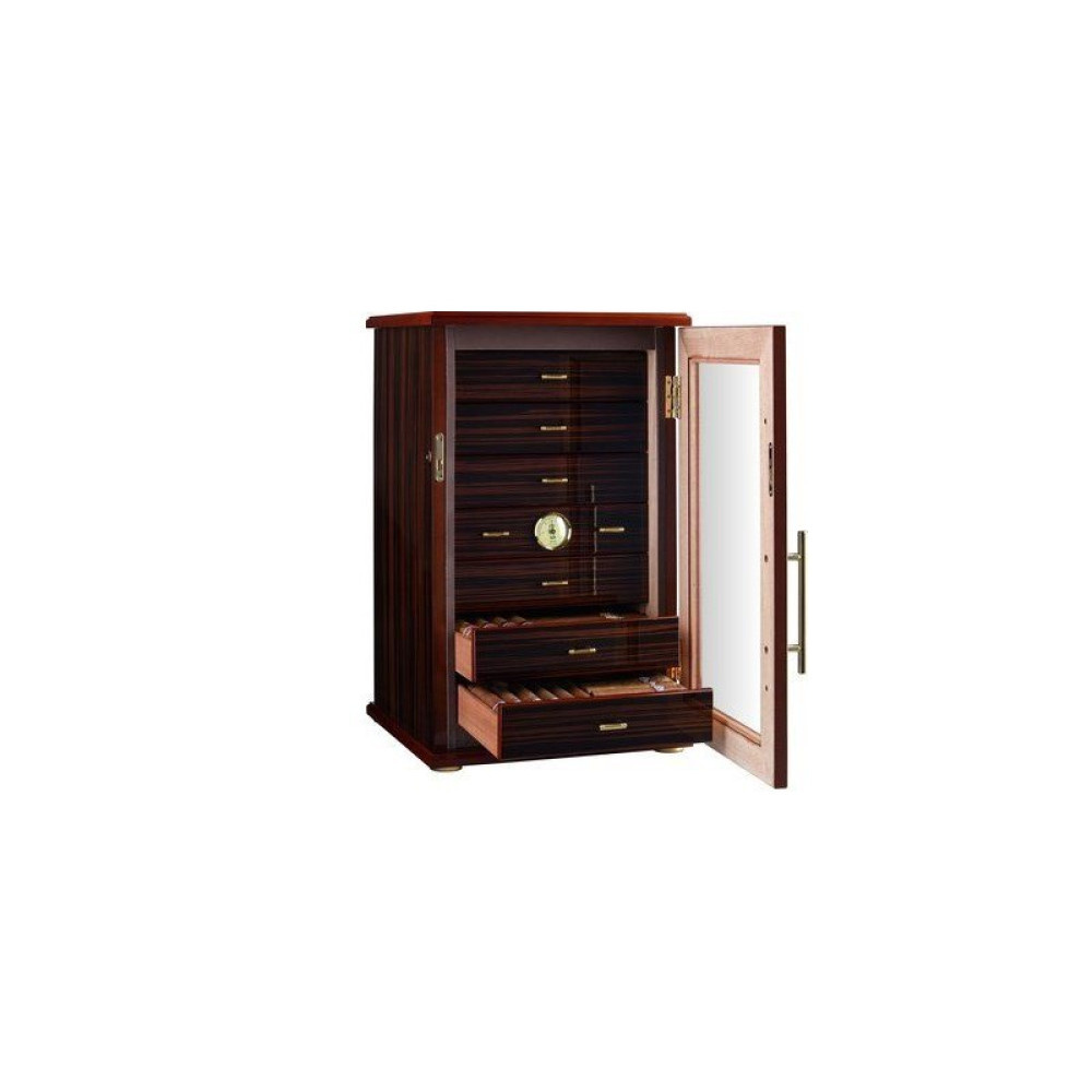 Adorini Grande Deluxe glänzend lackierter Ebenholz-bezogener Zigarrenschrank mit Glastür - das Zigarrenfach fasst 238 Corona-Zigarren. Der Zigarrenschrank ist mit 7 ausziehbaren Schubladen und mehreren Schichten Hochglanzlackierung ausgestattet. Dank der Glastür haben Sie einen freien Blick auf die Luftfeuchtigkeit, die optimiert ist, um die für die Zigarren erforderliche Luftfeuchtigkeit zu messen , und Sie können Ihren wunderschön gestalteten Humidor genießen, die ausziehbaren Schubladen sind mit Belüftungslöchern ausgestattet, um eine gleichmäßige Luftfeuchtigkeit zu gewährleisten, und es gibt insgesamt 14 Trennstreifen, mit denen Sie die Zigarren in den Schubladen organisieren können. Die Tür schließt sicher mit einem Magneten, und der Adorini Deluxe Luftbefeuchter aus Acrylpolymerkristall im Humidor sorgt für die richtige Luftfeuchtigkeit, der an der Rückseite der Schubladen befestigt werden kann. Die Schubladen lassen sich mit Hilfe von kleinen Griffen herausziehen, in der mittleren Schublade ist das vorkalibrierte, hochpräzise Kunsthaar-Hygrometer eingebaut. Der Zigarrenschrank kann mit einem Schlüssel verschlossen werden.