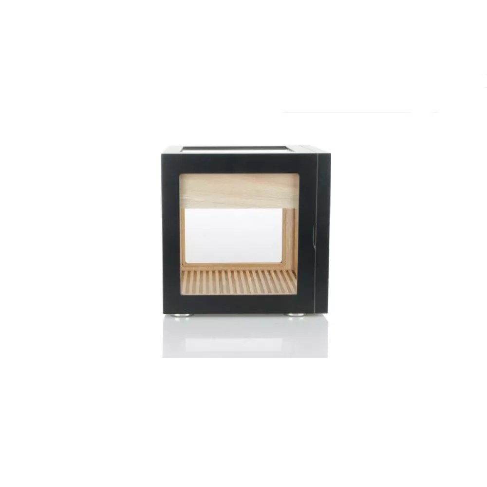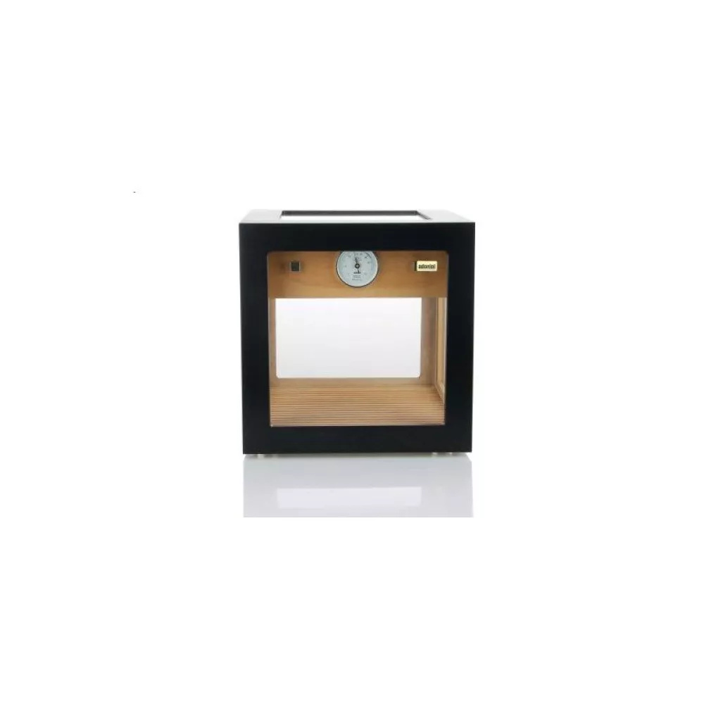 Der Adorini Cube Deluxe Humidorschrank ist mattschwarz und nicht nur mit einer Glastür, sondern auch mit Glas rundherum, sogar die Oberseite! Der Zigarrenschrank bietet Platz für 100 Corona Zigarren. Dank des Glases haben wir einen freien Blick auf den Feuchtigkeitsmesser und unsere Lieblingszigarren und können uns an unserem wunderschön gearbeiteten Humidor erfreuen, dessen Außenseite mit hochwertigen schwarzen Lacken überzogen ist. Die Tür schließt sicher mit einem Magneten, und der Adorini Deluxe Luftbefeuchter mit vergoldetem Deckel und einem Luftbefeuchter auf Acrylpolymerbasis im Humidor sorgt für die richtige Luftfeuchtigkeit, der am Boden der Schublade befestigt werden kann. Die Schublade kann mit Hilfe von kleinen Griffen herausgezogen werden, in der Mitte ist das Kunsthaar-Hygrometer eingebaut.