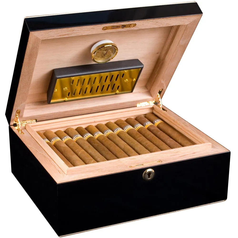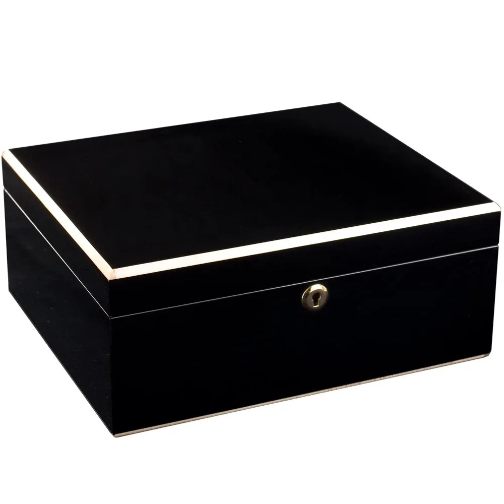 Der adorini Humidor Milan Medium Deluxe ist mehrfach in glänzendem Schwarz lackiert und bietet Platz für bis zu 75 Zigarren. Ein besonderes Highlight ist die weiß-goldene, abgeschrägte Kante, die den Deckel umlaufend ziert. Schloss und Schlüssel sind vergoldet. Im Inneren besteht der Humidor aus spanischem Zedernholz, und die RibTech-Belüftungsrippen sorgen für eine ideale Luftzirkulation. Der vergoldete Adorini Deluxe Befeuchter und das vorkalibrierte Hygrometer lassen sich magnetisch an der Innenseite des Deckels flexibel anbringen. Gewicht: 3,49 Kg, Maße: 29 cm x 12 cm x 18,4 cm
