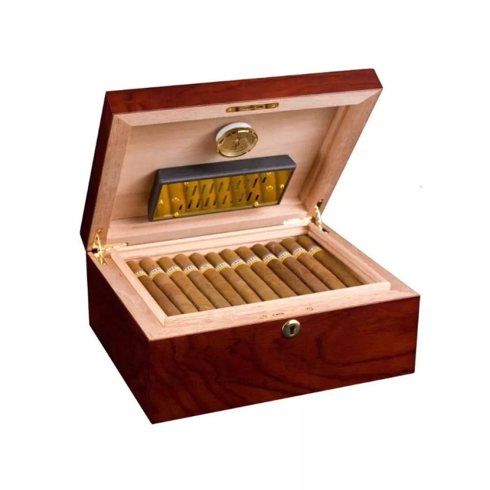 Adorini Humidore - Triest medium Deluxe ist ein Humidor für 50-75 Zigarren und ist mit einem Hygrometer ausgestattet. Befeuchtungs-Einrichtung: Acrylpolymere Befeuchtungssystem. Material außen: Hochwertige Mehrfachlackierung. Material innen: spanisches Zedernholz. Das Aussenmaß des Humidors ist: H 12 cm x B 29 cm x T 24 cm. Das Innenmaß beträgt: H 10,3 cm x B 23,3 cm x T 18,4 cm.