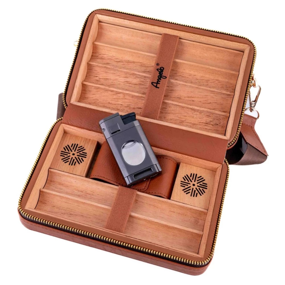 Der Angelo Reisehumidor eignet sich für die Aufbewahrung von 6 Zigarren mit einem eleganten braunen Lederbezug. Das Innere des Humidors besteht vollständig aus Zedernholz, was dazu beiträgt, die Frische und den Geschmack der Zigarren zu bewahren.