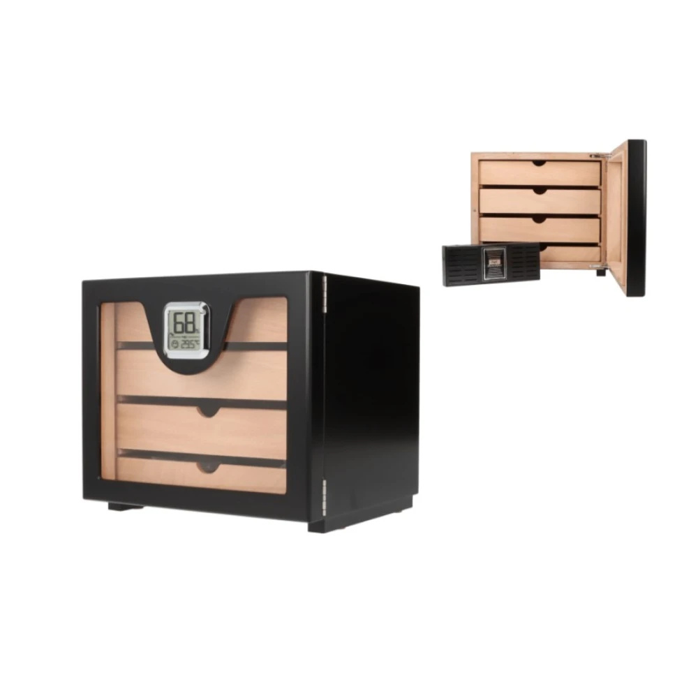 Der Humidor hat außen eine moderne schwarze Oberfläche, während das Innere und die vier geräumigen Schubladen aus hochwertigem Zedernholz gefertigt sind, das optimal die Reifung von Zigarren und die Bewahrung ihres Aromas unterstützt. Das Schubladendesign ermöglicht eine klare Organisation verschiedener Zigarrengrößen und -arten.