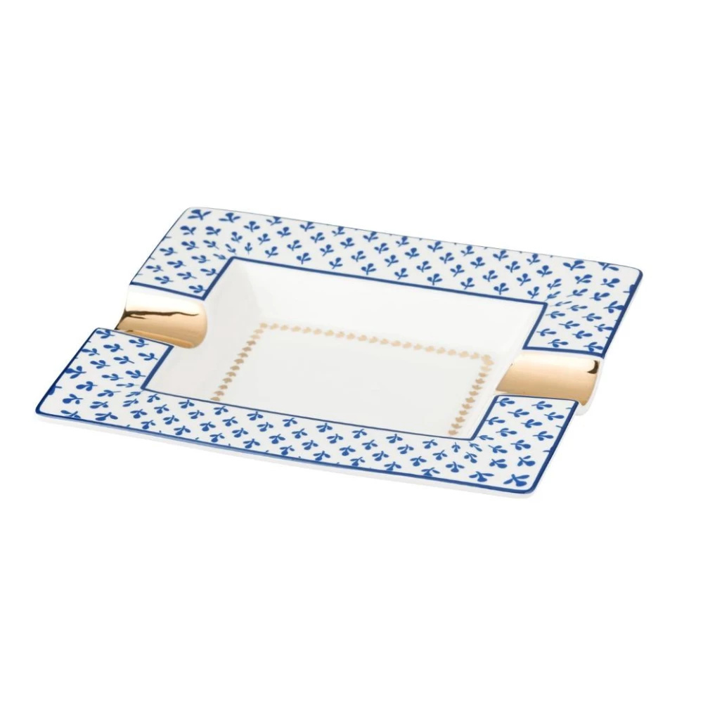 Zigarrenaschenbecher aus Keramik für 2 Zigarren, verziert mit blauen Blättern. Er ist der perfekte Aschenbecher für den Alltag und festliche Anlässe gleichermaßen. Es hat eine einfache, aber schöne Form, so dass es überall perfekt passt. Der Platz der Zigarren wurde mit einem goldfarbenen Überzug versehen. Aschenbecher werden separat für Zigarrenraucher angefertigt, da normale Aschenbecher dafür nicht ausgelegt sind. Zigarren würden allein aufgrund ihrer Größe mehr Tabak enthalten als Zigarillos oder Zigaretten, und deshalb wird es viel mehr Asche geben. Im Zigarrenaschenbecher kann die Zigarre weder fallen noch rollen, was unangenehme Brandflecken auf dem Tisch verhindert.
