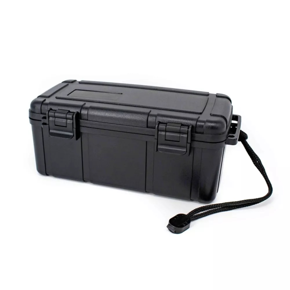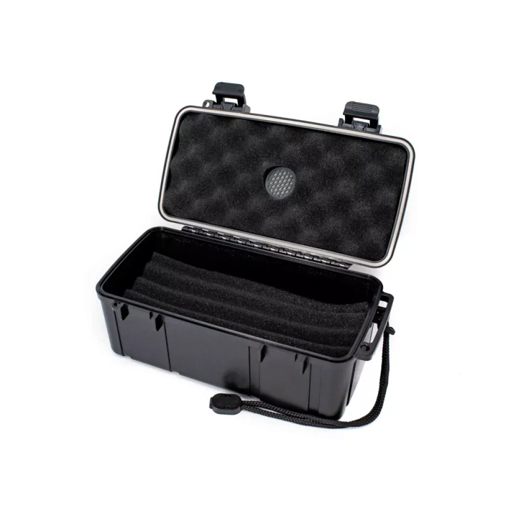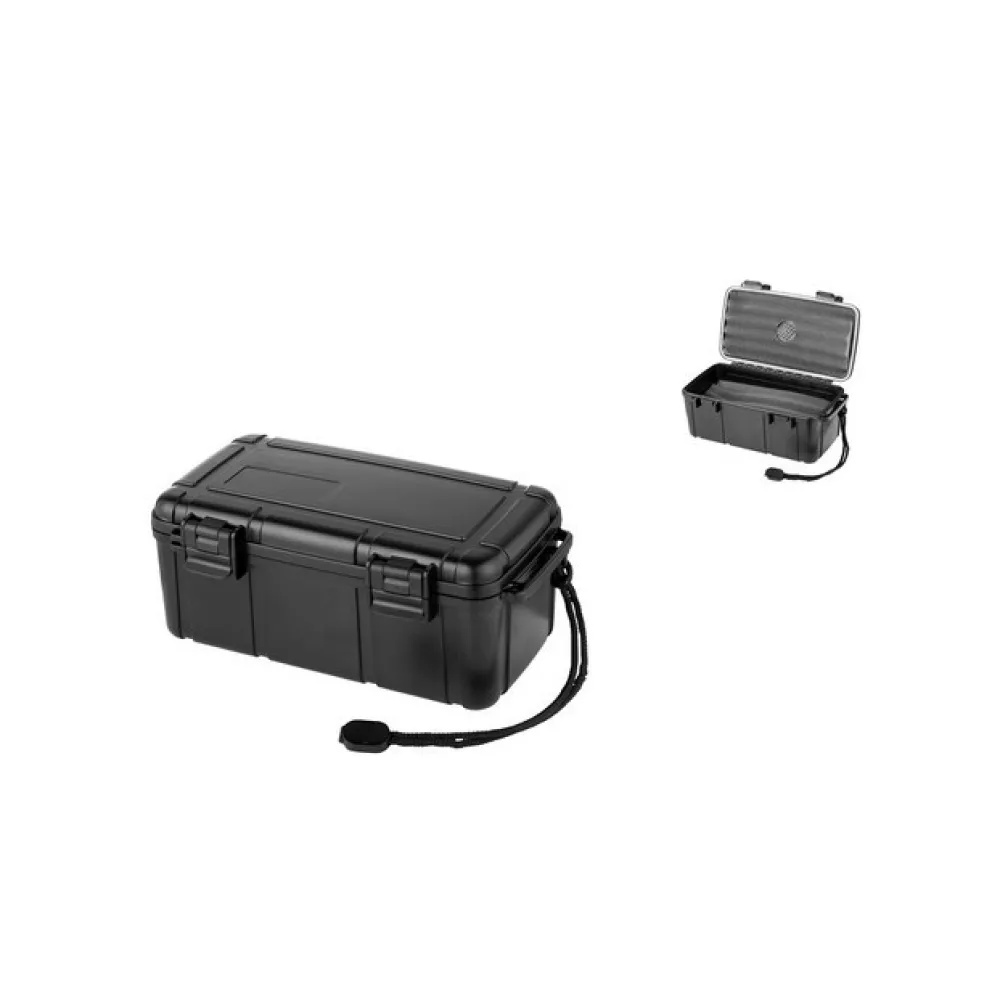 Schwarze Zigarrenhalterbox aus Kunststoff, die 15 Zigarren aufnehmen kann, mit herausnehmbarem Schwamminneren in schwarzer Farbe und Schwammbefeuchter. Geschützt durch einen Reisehumidor Die Zigarren sind vor äußeren Beschädigungen geschützt und das Schwammfutter verhindert, dass sich die Zigarren im Zigarrenlager bewegen, so dass die äußeren Blätter der Hülle nicht beschädigt werden können.Der perfekte Reisebegleiter für unterwegs.