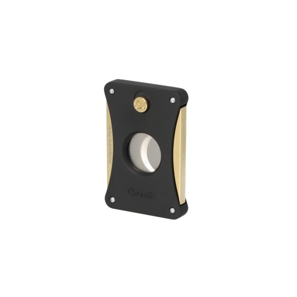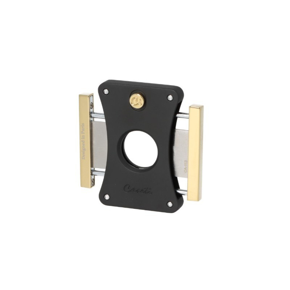 Zigarrenschneider Caseti mit doppelter Klinge und goldfarbener Caseti Zigarrenschneider aus Edelstahl. Der Doppelklingenschneider liegt mit der Federwirkung und dem Sicherheitsöffnungsknopf perfekt in der Hand. Die scharfen Klingen des Rasierers garantieren einen perfekten Schnitt. Der Zigarrenschneider für eine Zigarrengröße bis zu 54 Ringe, mit dem Caseti-Logo auf dem Druckknopf.Es wird in einer mit Samt gefütterten Geldbörse in einer Geschenkbox geliefert.