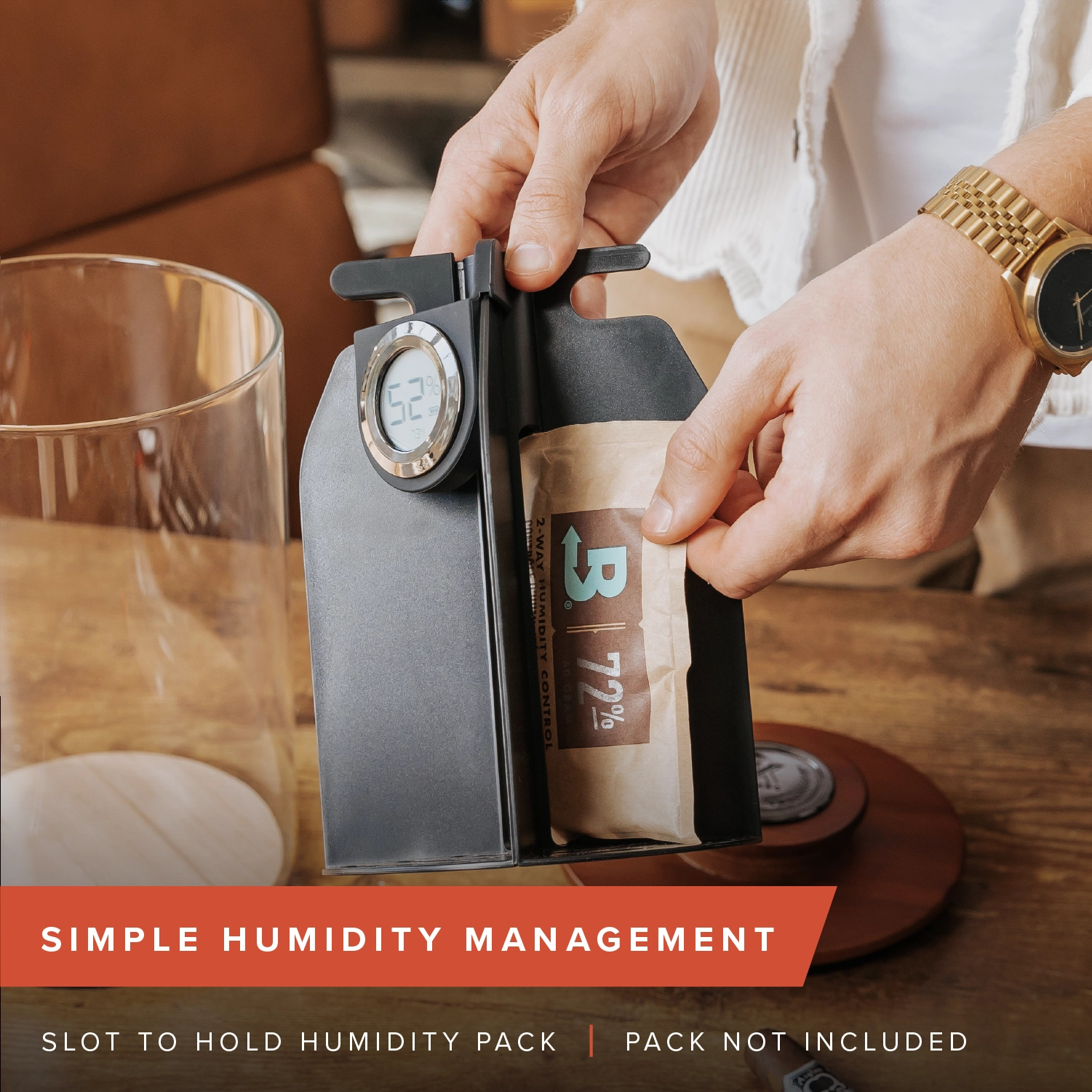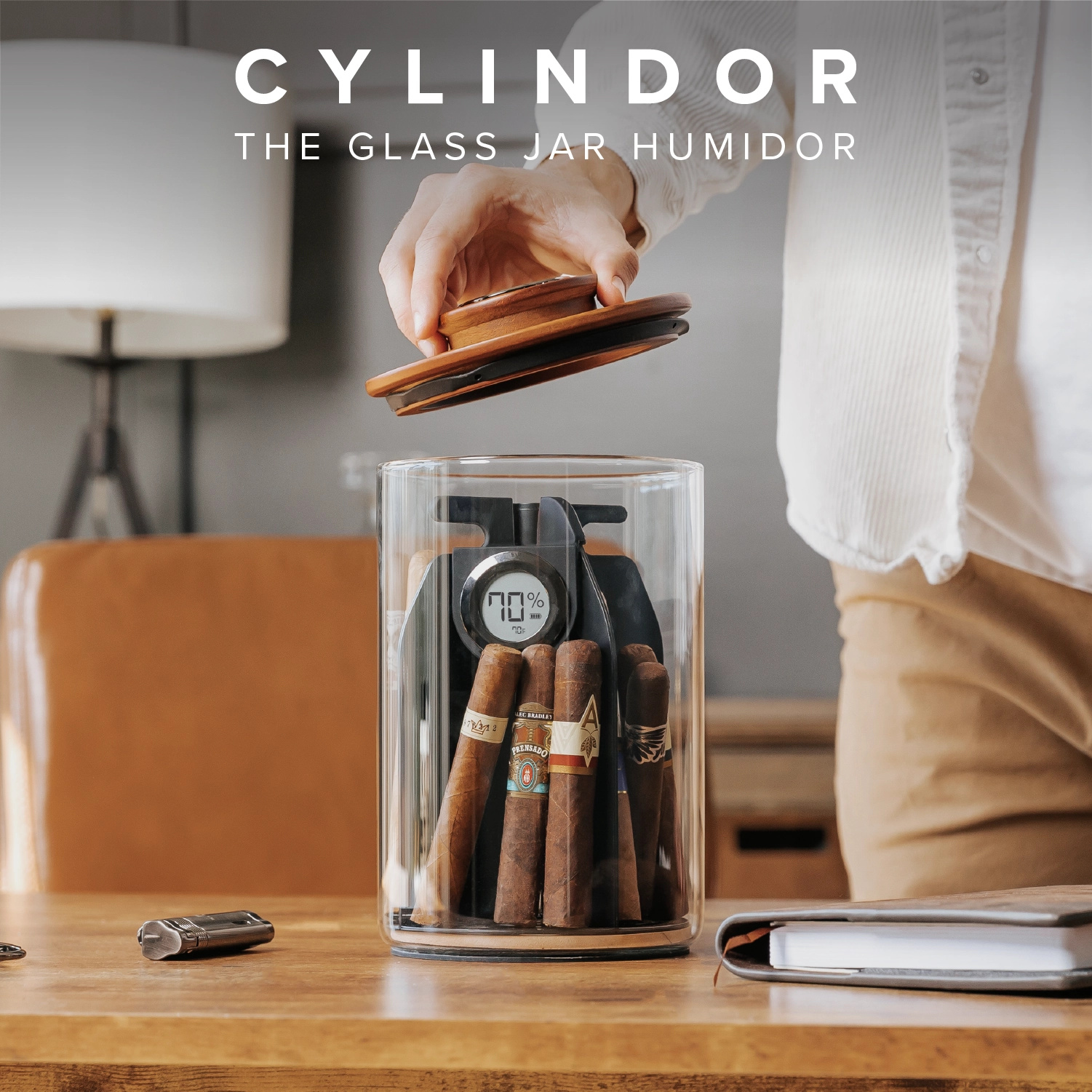 Der Cylindor wurde auf Basis von Kundenfeedback entwickelt und verfügt nun über ein internes Hygrometer in einem einzigartigen Gummigehäuse am Trennfach. Diese Positionierung gewährleistet höchste Feuchtigkeitsgenauigkeit, minimiert den Luftkontakt und ermöglicht ein einfaches Ablesen der Feuchtigkeitswerte.