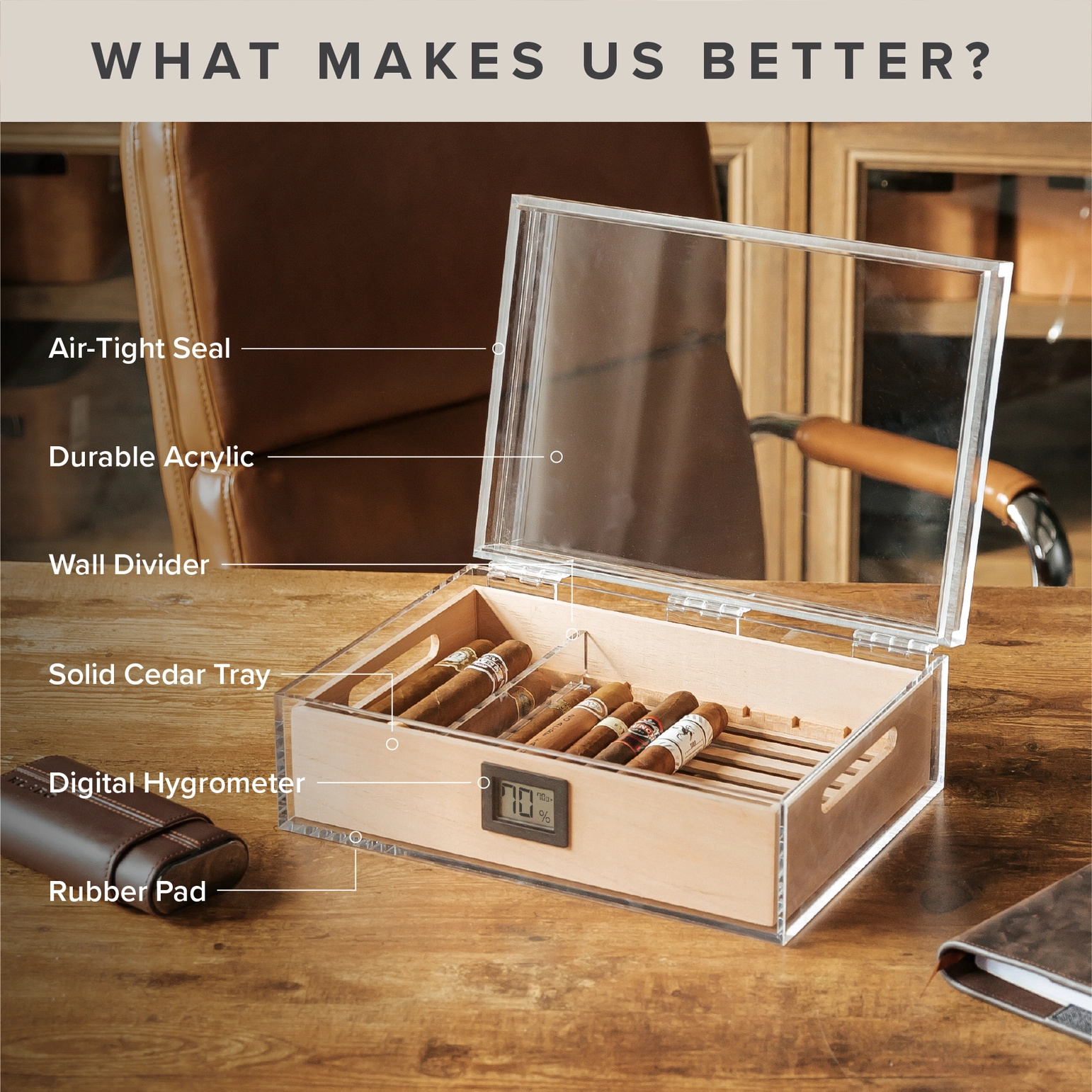 Das Acrylglas des Felix Humidors bietet Langlebigkeit, klare Sicht für einfache Kontrolle und einen zuverlässigen Verschluss für optimale Zigarrenaufbewahrung. Es vereint modernen Komfort mit Schutz in einem eleganten Design.