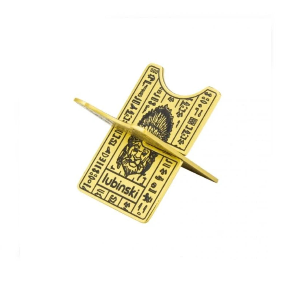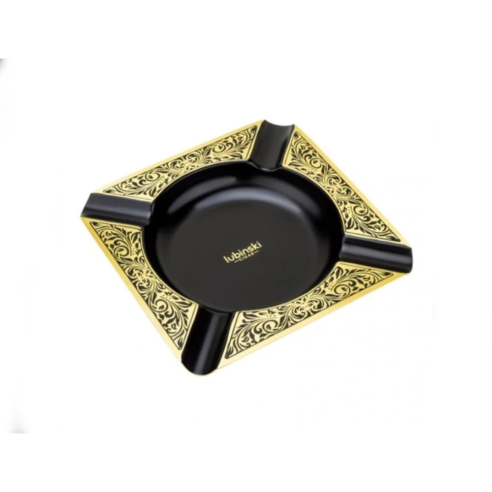 Goldene, hochwertige Zigarren mit barockem Muster auf schwarzem Metallgrund, für 4 Zigarren. In der Mitte des Zigarrenaschenbechers befindet sich das Lubinski Cigar Branding. Die Kante ist leicht zu greifen. Der Aschenbecher ist so konstruiert, dass die Zigarre waagerecht darauf aufliegen kann und ihr so ein langer, gleichmäßiger Abbrand beschert wird.