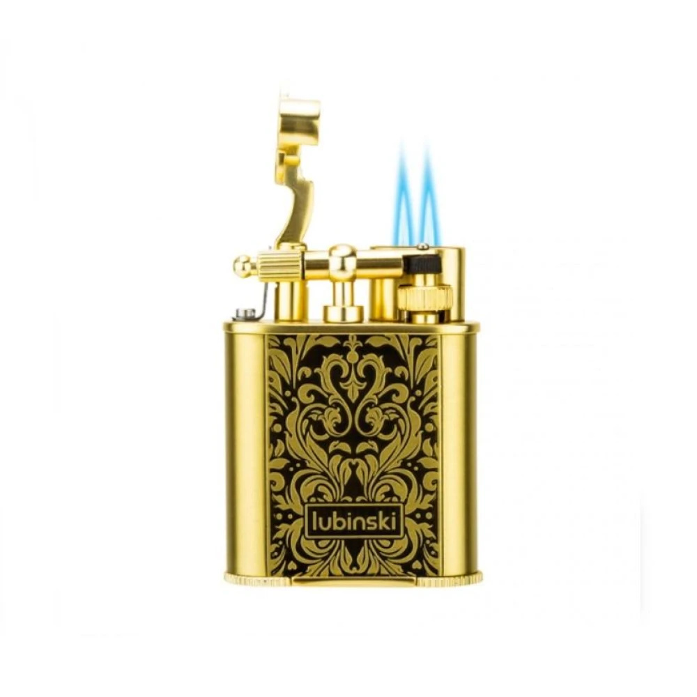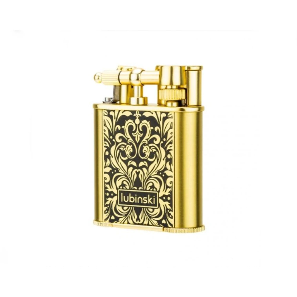 Metallgehäuse in Goldfarbe, schwarz mit barockem Muster undeinem Gewitterfeuerzeug mit 2 durchdringenden Flammen. Das Feuerzeug kann an der Unterseite aufgeladen werden, und die Größe der Flamme kann nach dem Entfernen des großen Einstellrads, das in der Unterseite eingebaut ist, eingestellt werden. Die scharfe Klinge des 8 mm Zigarrenbohrers, die in den Boden ausgerollt werden kann, hält keiner Zigarre stand. Das Feuerzeug ist auf beiden Seiten mit dem Lubinski Cigar Branding versehen.