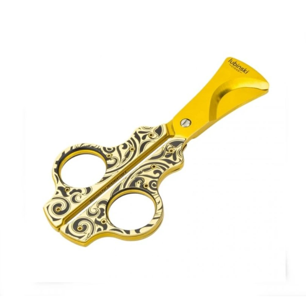 Goldfarbene Zigarrenschneideschere mit Barockmuster und Lubinski-Zigarrenaufschrift auf der Klinge. Hergestellt aus Edelstahl, ergonomischer, komfortabler Doppelfingergriff. Mit einer Zigarrenschere können wir die meisten ringgroßen Zigarrenkappenteile problemlos abschneiden, was für einen sauberen und präzisen Schnitt sorgt. Eine Zigarrenschere ist eine der hochwertigsten Möglichkeiten, Zigarren zu schneiden, vor allem, wenn sie mit einem so dekorativen Cutter gemacht wird.