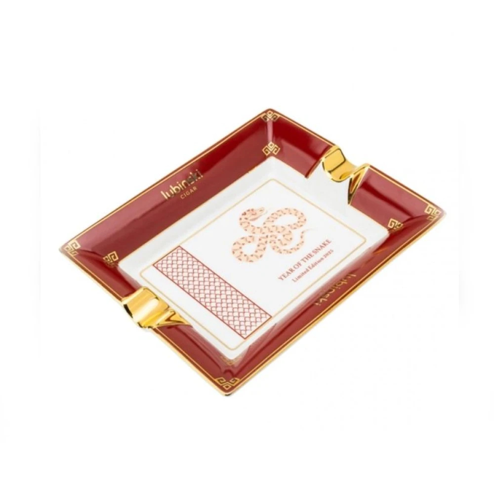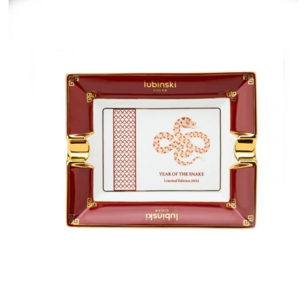 Hochwertiger Zigarrenaschenbecher aus Porzellan für 2 Zigarren. Ein kunstvolles Stück der ikonischen Zigarrenmarke Lubinski, eine limitierte Edition, die zu Ehren des Jahres der chinesischen Schlange hergestellt wird. Auf weißem Hintergrund, mit einem burgunderroten Rand und einem Schlangenmuster, wird dieser Aschenbecher zu etwas Besonderem. Die Zigarrenwiege ist goldfarben für den perfekten Gesamtlook. Am Rand des Zigarrenaschenbechers befindet sich die Aufschrift Lubinski Cigar. Sie eignet sich auch perfekt für große Zigarren, sie verfügt über eine Aschekammer mit großem Fassungsvermögen. Die Kante ist leicht zu greifen.