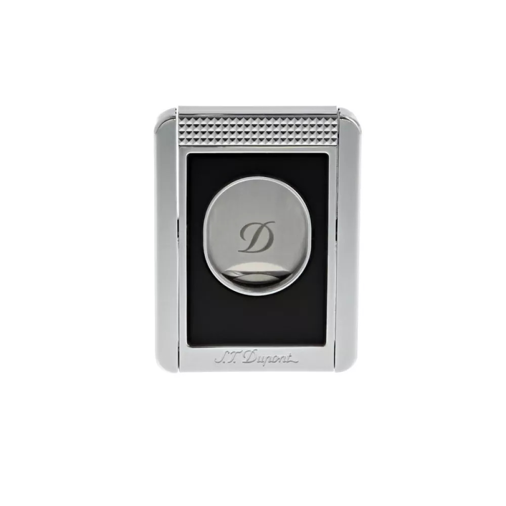 Die Vorder- und Rückseite des Cutters sind mit edlem schwarzem Lack veredelt, während die Seiten in glänzendem Silber gehalten sind. Auf der Vorderseite befindet sich ein eingravierter "S.T. Dupont"-Schriftzug und auf der Klinge das charakteristische Logo der Marke, das den Premium-Look des Produkts weiter unterstreicht.