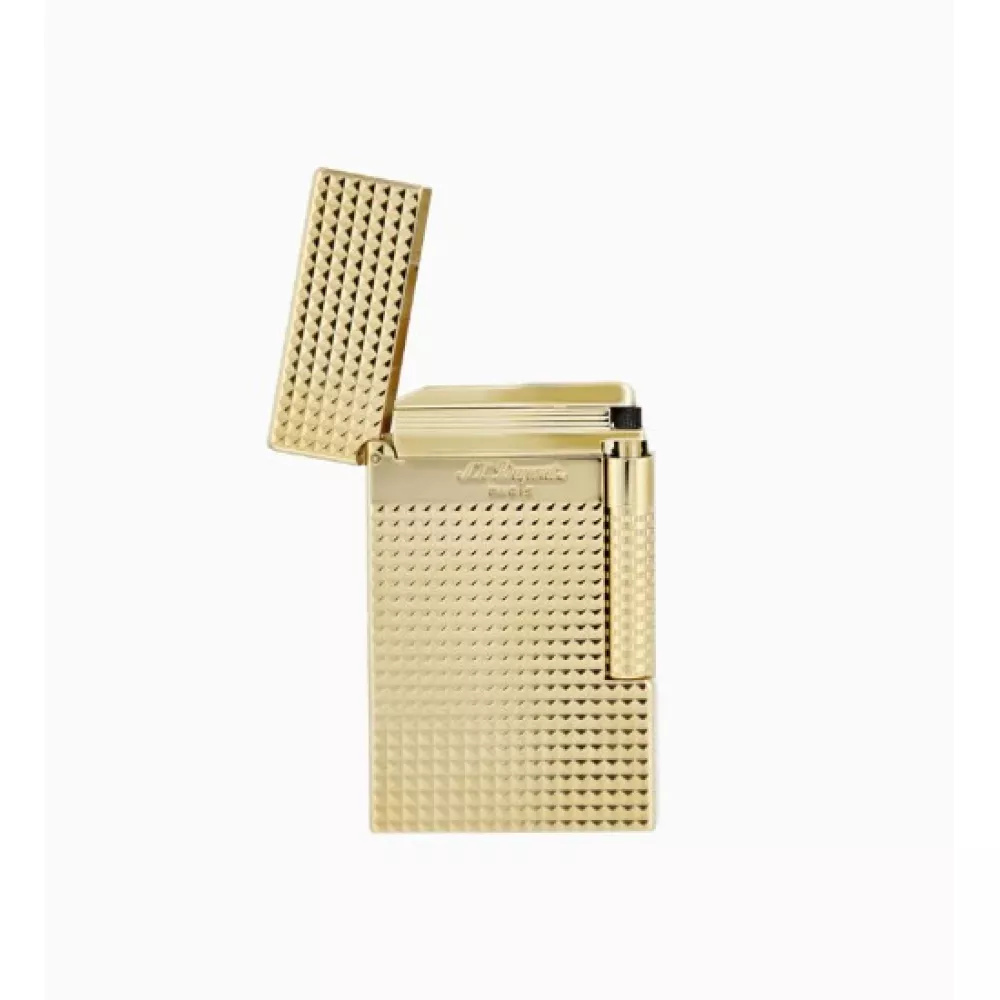 S.T. Dupont Le Grand Cling Zigarettenanzünder mit Goldbeschichtung mit Diamantkopfmuster. Diese Modellreihe ist eine Kombination aus der Serie Ligne 2 und der revolutionären Innovation der Doppelflamme von Dupont.Das Besondere an den LE GRAND Feuerzeugen ist die Doppelflamme (durchdringende Flamme und die normale Flamme), die Le Grand Feuerzeuge sind etwas größer als die Feuerzeuge der L2 Serie. Mit den S.T. Dupont Le Grand Feuerzeugen müssen Sie sich nicht zwischen einer Filterflamme und einer normalen Flamme entscheiden. Mit der auf der Vorderseite des Feuerzeugs eingravierten Aufschrift "S.T. Dupont Paris" und einem breiten Zündrad kann das Feuerzeug an der Unterseite nachgefüllt und auch hier die Flammengröße angepasst werden. Was Sie sicherstellen müssen, ist, dass Sie Ihr Feuerzeug immer mit original S.T. Dupont Gas befüllen. Für dieses Dupont-Feuerzeug ist die rot (000435) Wir empfehlen ein original Dupont Feuerzeugladegerät.