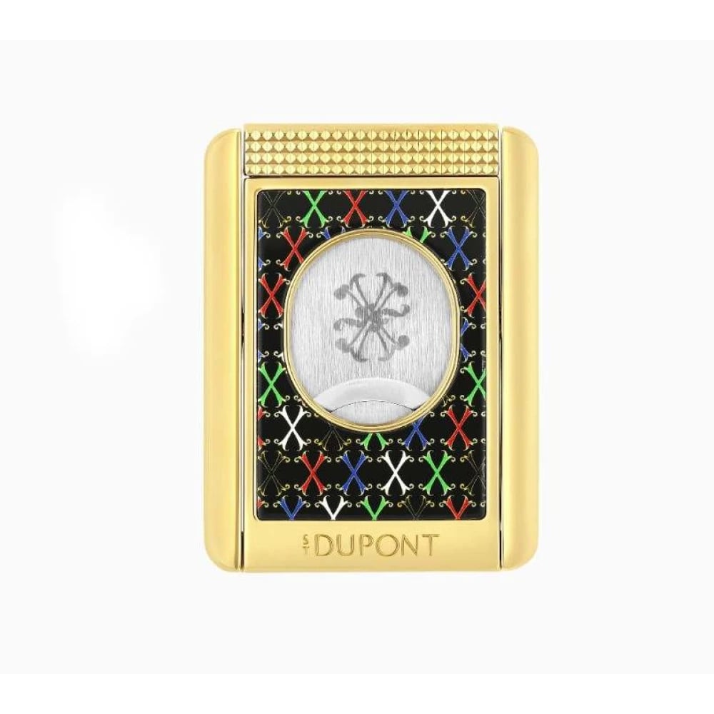 Der Zigarrenschneider ist mit der Präzision von S.T. Dupont gestaltet und verbindet französische Eleganz mit der Leidenschaft der karibischen Zigarrenwelt. Der vergoldete Metallkorpus ist mit einer schwarzen Lackierung verziert, die mit gekreuzten Schwertmotiven in Rot, Grün, Blau und Weiß überzogen ist und an das charakteristische Muster der Opus X erinnert.
